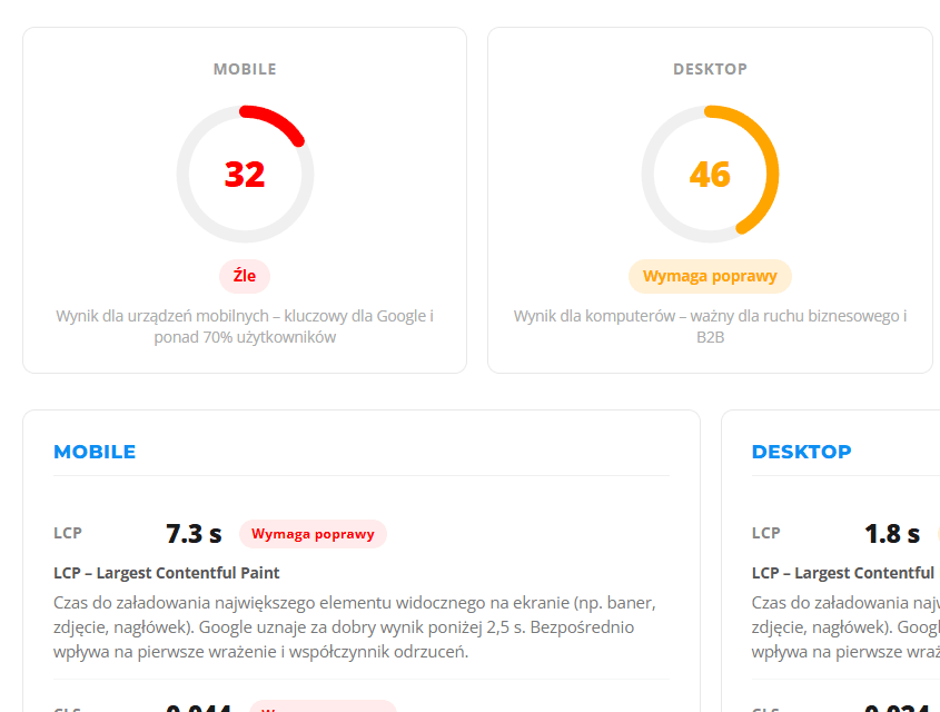 Ciągła opiekaOpieka miesięcznaDbamy o to, żeby wyniki się utrzymały po optymalizacji. Monitorujemy wydajność, reagujemy na spadki, aktualizujemy WordPress i wtyczki. Ty skupiasz się na biznesie.Monitoring wydajnościAktualizacje WP i wtyczekReakcja na spadki wynikówMiesięczny raportWsparcie techniczne300 złnetto / miesiąc · bez okresu minimalnego Zamów opiekę →