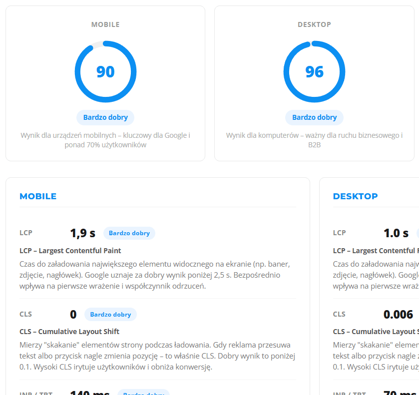 Dobry startStartPodstawowa optymalizacja dla stron WordPress. Cache, obrazy, Cloudflare i usunięcie balastu – szybkie efekty bez ingerencji w kod.WordPress / ElementorWizytówki / landing pageStrony firmowe500 złnetto · jednorazowoAudyt wydajnościPageSpeed Insights, Core Web VitalsKonfiguracja cacheLiteSpeed Cache / W3 Total CacheOptymalizacja obrazówkompresja, WebP, lazy loadingCloudflare CDNSSL, reguły cache, minifikacjaUsunięcie balastuzbędne wtyczki, skrypty, styleRaport przed i powyniki + krótki plan kolejnych kroków Zamów pakiet